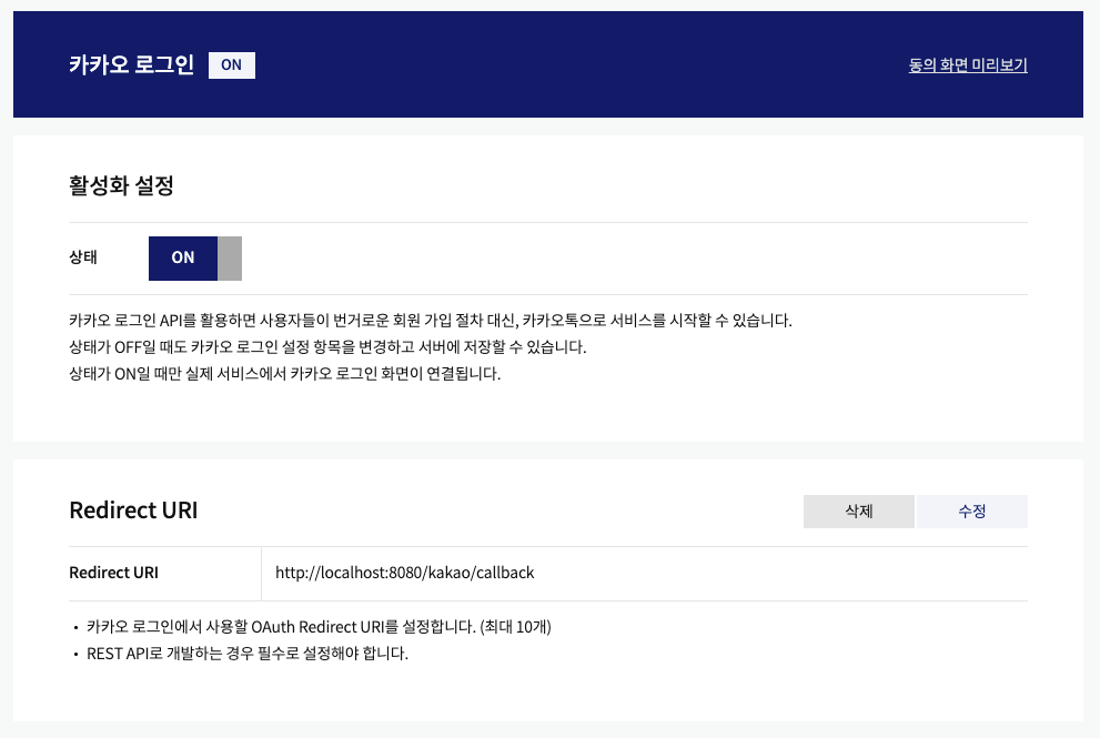 이후 좌측의 '제품 설정 - 카카오 로그인' 란에서 카카오 로그인을 활성화 한다. Redirect URL도 설정해놓는다.
