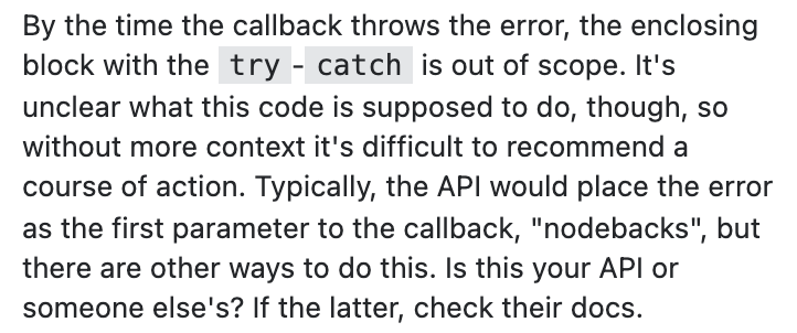 이 때 콜백에서 에러가 터져도 try-catch는 에러 터진 스코프 밖의 범위기 때문에 캐치를 못하는 것이다.