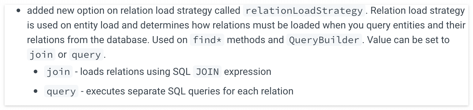 그러나 공식 문서의 change log를 읽어보면 query를 사용하면 join을 사용하지 않고 relation마다 쿼리를 따로 보낸다고 되어있다. 따라서 위 해결법은 진짜 해결법이 아닌 버그를 사용한 우회법 같다... 🙃 이 버그에 대한 이슈도 등록되어있으며 아직 해결은 안 된 상태다.