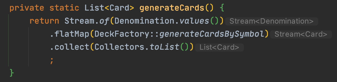 스트림의 각 연산으로 데이터를 처리할 때마다 우측에 어떤 타입을 반환하는 지 보여준다. 보다시피 중간 연산자는 Stream<T> 반환을 주로 한다.