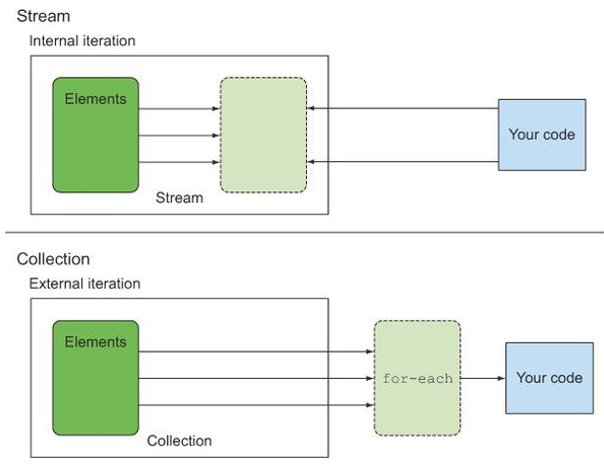컬렉션과 스트림 둘 다 연속된 요소 형식의 값을 저장하는 자료구조의 인터페이스를 제공한다. 하지만 컬렉션은 현재 자료구조가 포함하는 모든 값을 메모리에 저장하는 자료구조다. 스트림은 요청할 때만 요소를 계산하는 고정된 자료구조다. 게으르게 만들어지는 컬렉션과 같다. 때문에 스트림은 무한 스트림을 생성할 수 있다.