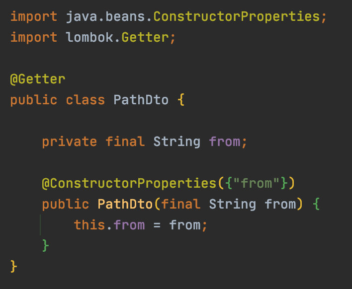 ConstructorProperties 는 생성자의 속성 명칭을 지정해지주는 어노테이션으로 역직렬화를 쓰는 데 이용한다. 역직렬화 문제를 해결하면 되기에 처음엔 이렇게 바꿔주었다.
