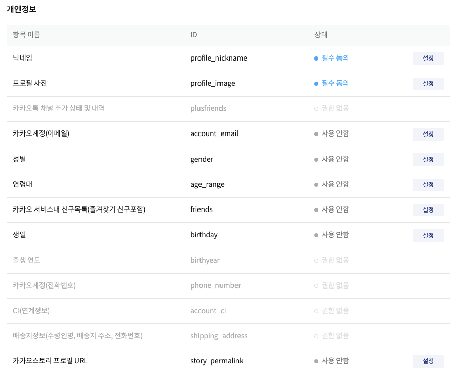 내 애플리케이션 - '제품 설정 - 동의 항목' 란에서 카카오 로그인으로 서비스를 시작할 때 동의 받는 항목을 설정한다.
